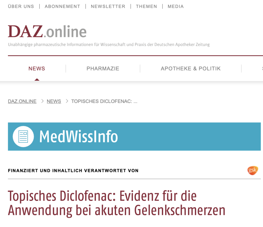Bei dem Bild unten gilt es den Widerspruch zu beachten. Die ‚unabhängige‘ Deutsche Apotheker Zeitung, veröffentlicht Beiträge die vom Hersteller der Schmerzgele GSK finanziert und inhaltlich verantwortet wird. Immerhin wird ja auf diese Tatsache aufmerksam gemacht. Aber wie ist das unabhängig?
