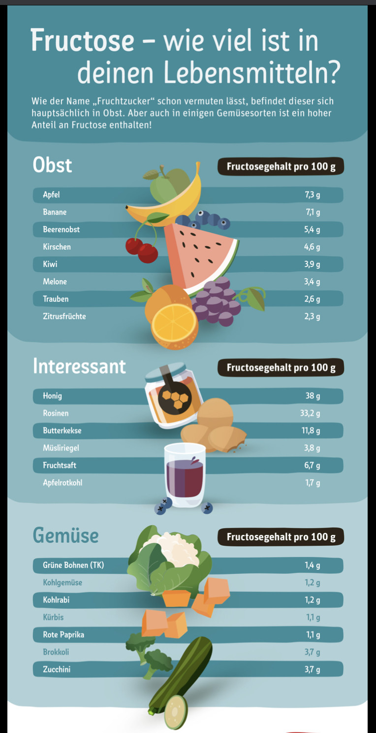 Es gibt viele Darstellungen auf denen der Fruktosegehalt verschiedener Obst und Gemüsesorten zu erkennen ist. Hier ist eine, die ich auf einer REWE Seite gefunden habe. Dies hilft solche Arten und Sorten zu wählen, die einen niedrigeren Fruktosegehalt haben.