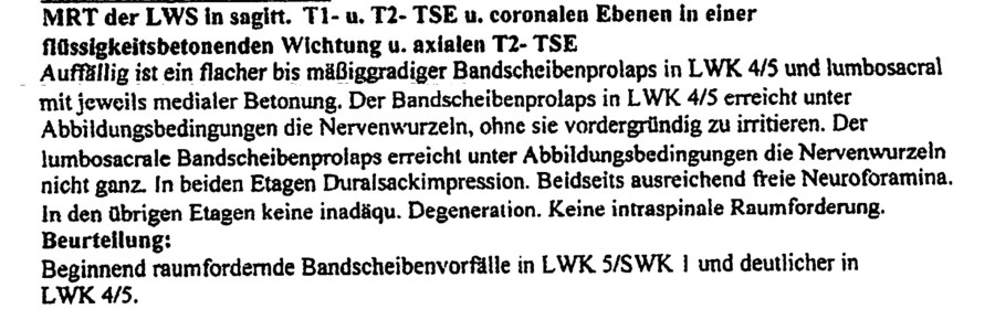 „Der Befund dieses MRT ist nicht relevant für die derzeitigen Beschwerden. Es sind lediglich Zeichen einer längerfristigen mechanischen Fehlbelastung zu erkennen. Diese Fehlbelastung sollte mit adäquater Behandlung und Übungstherapie adressiert werden.“