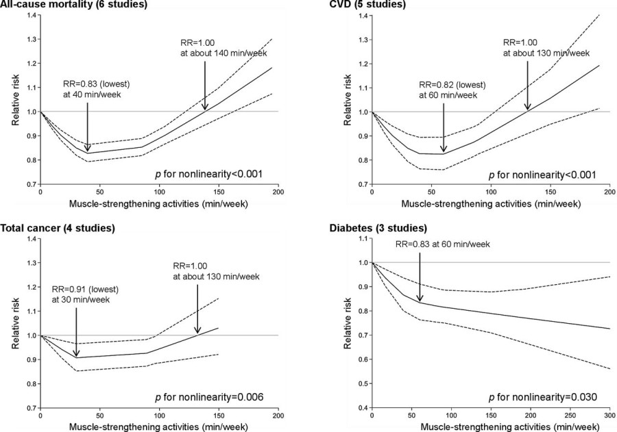 Es ist laut den Autoren und den ausgewerteten Studien unklar, ob viel mehr Kraftsport auch eine weitere Risikominderung bringt. Laut den aktuell untersuchten Studien, steigt das Risiko mit mehr Kraftsport wieder an. Außer bei Diabetes; hier nimmt das Risiko immer weiter ab.